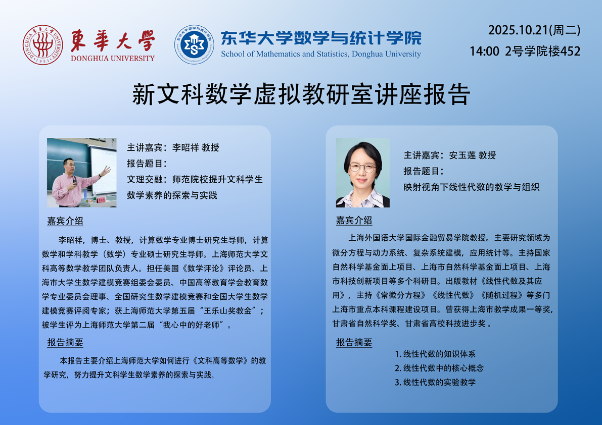 文科数学虚拟教研室启动研讨会,特邀上海师范大学文科数学负责人李昭祥教授和上海外国语大学安玉莲教授针对文科数学的教学实践给出宝贵经验。